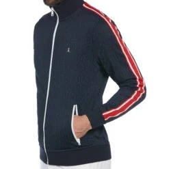 Featuring a slim fit design for a contemporary look, this men’s track jacket includes a striped accent for a classic athleisure look. Made with 100% durable double knit polyester for longevity, this jacket also features an allover logo print for added style. The full zip closure and zippered pockets offer added practicality.