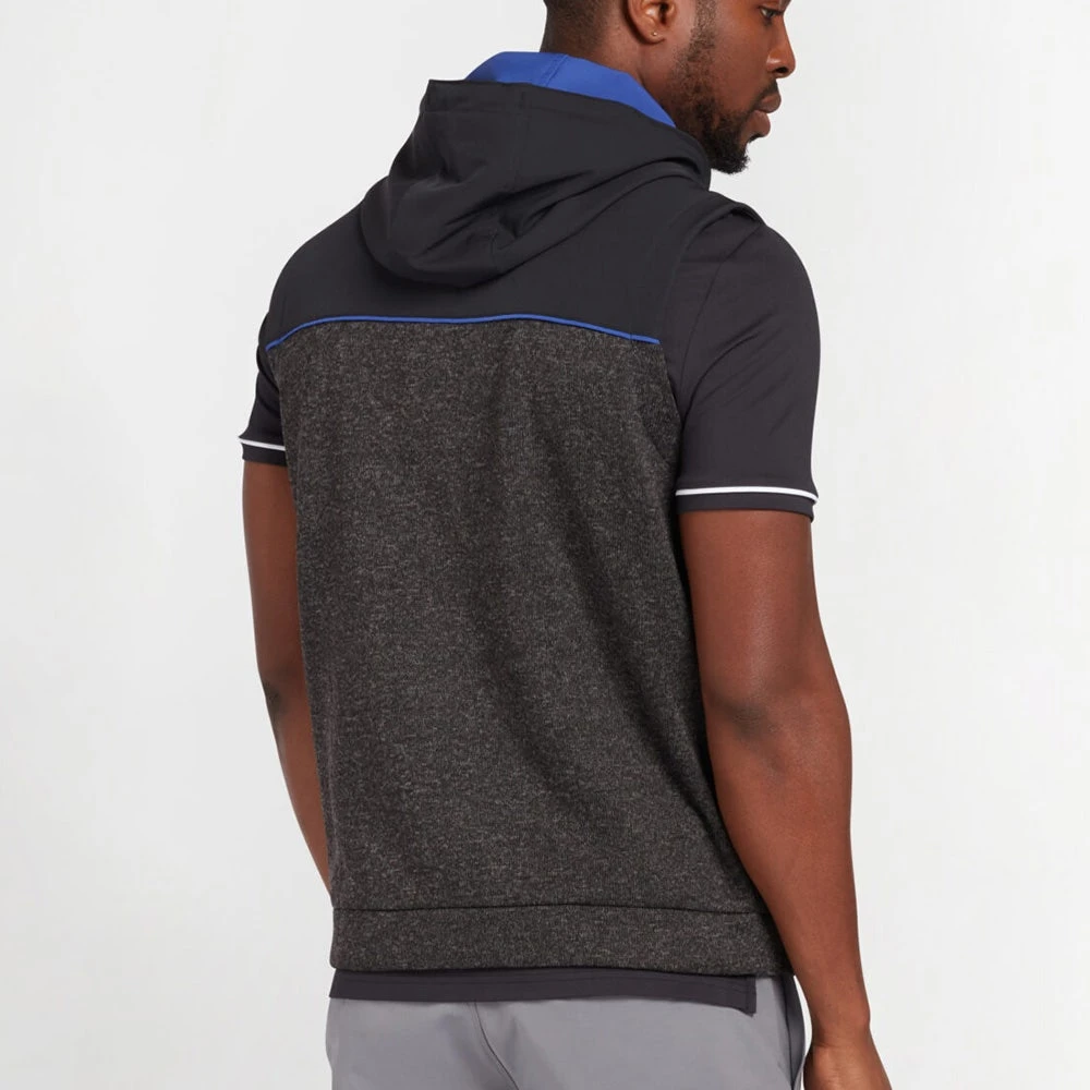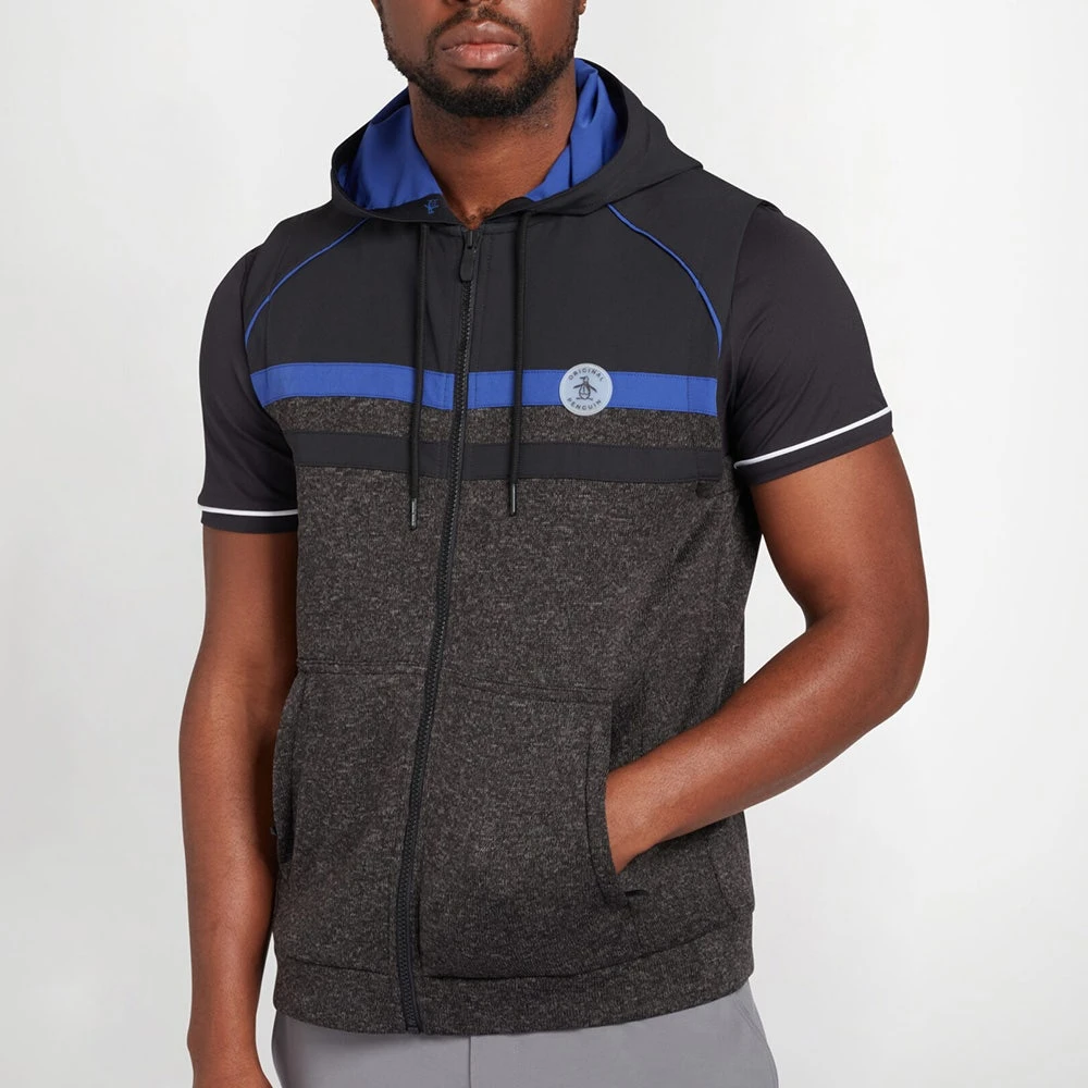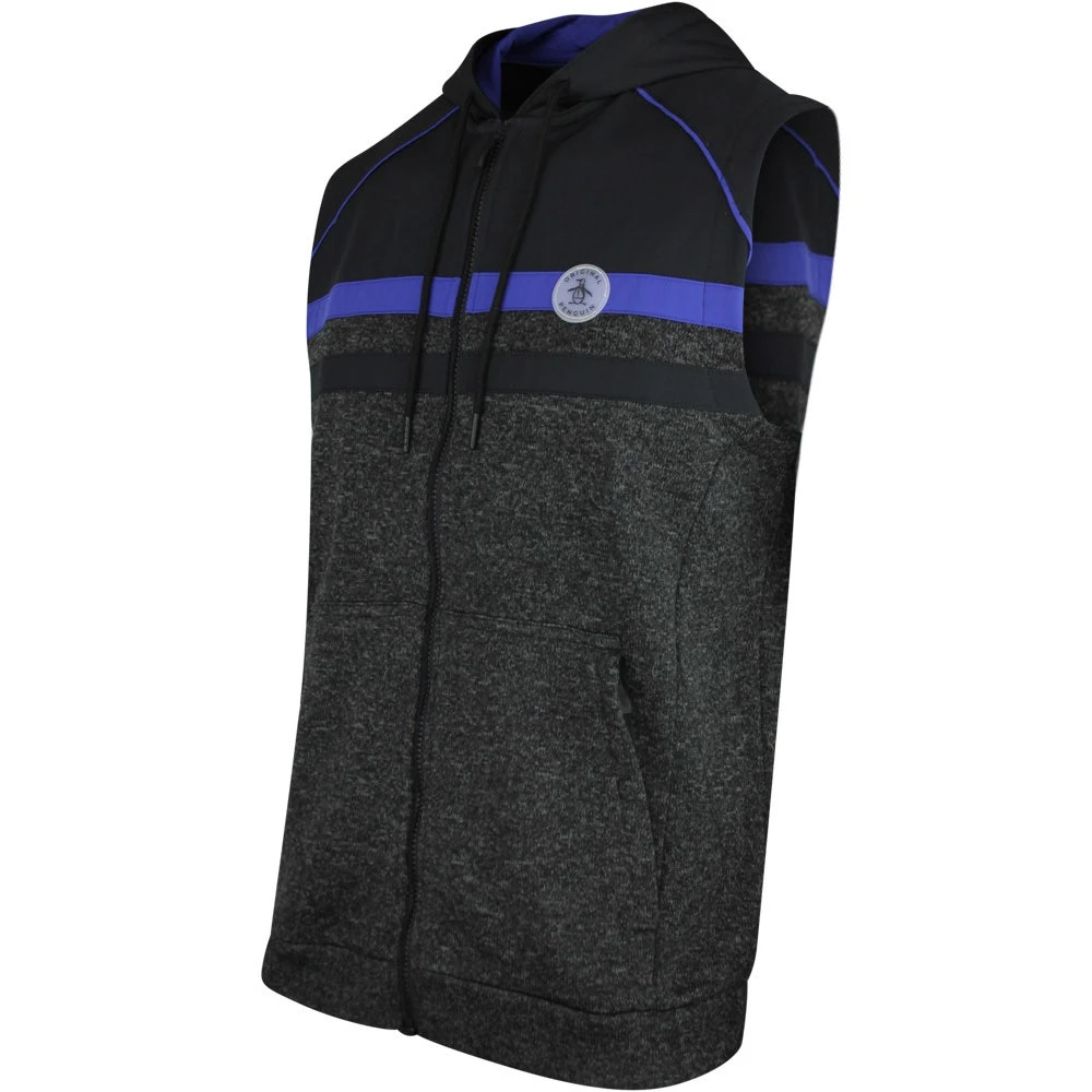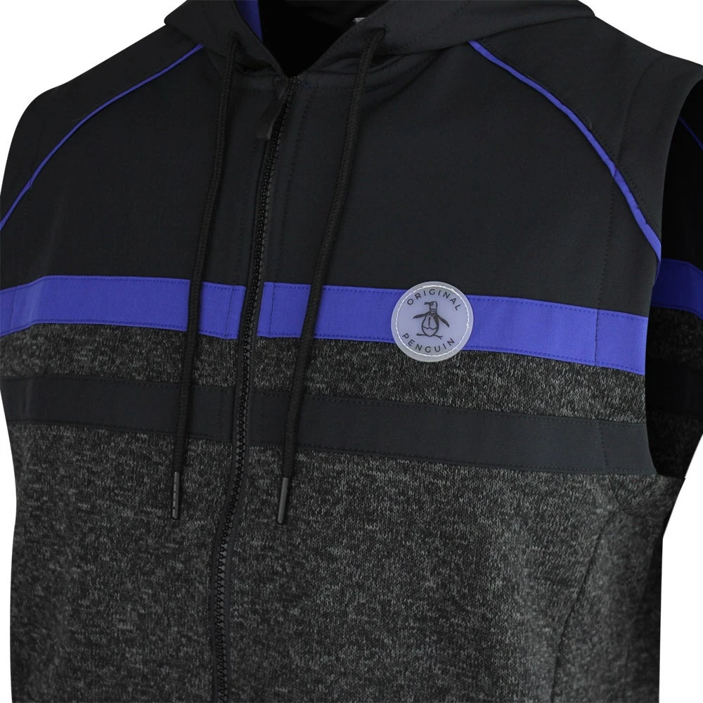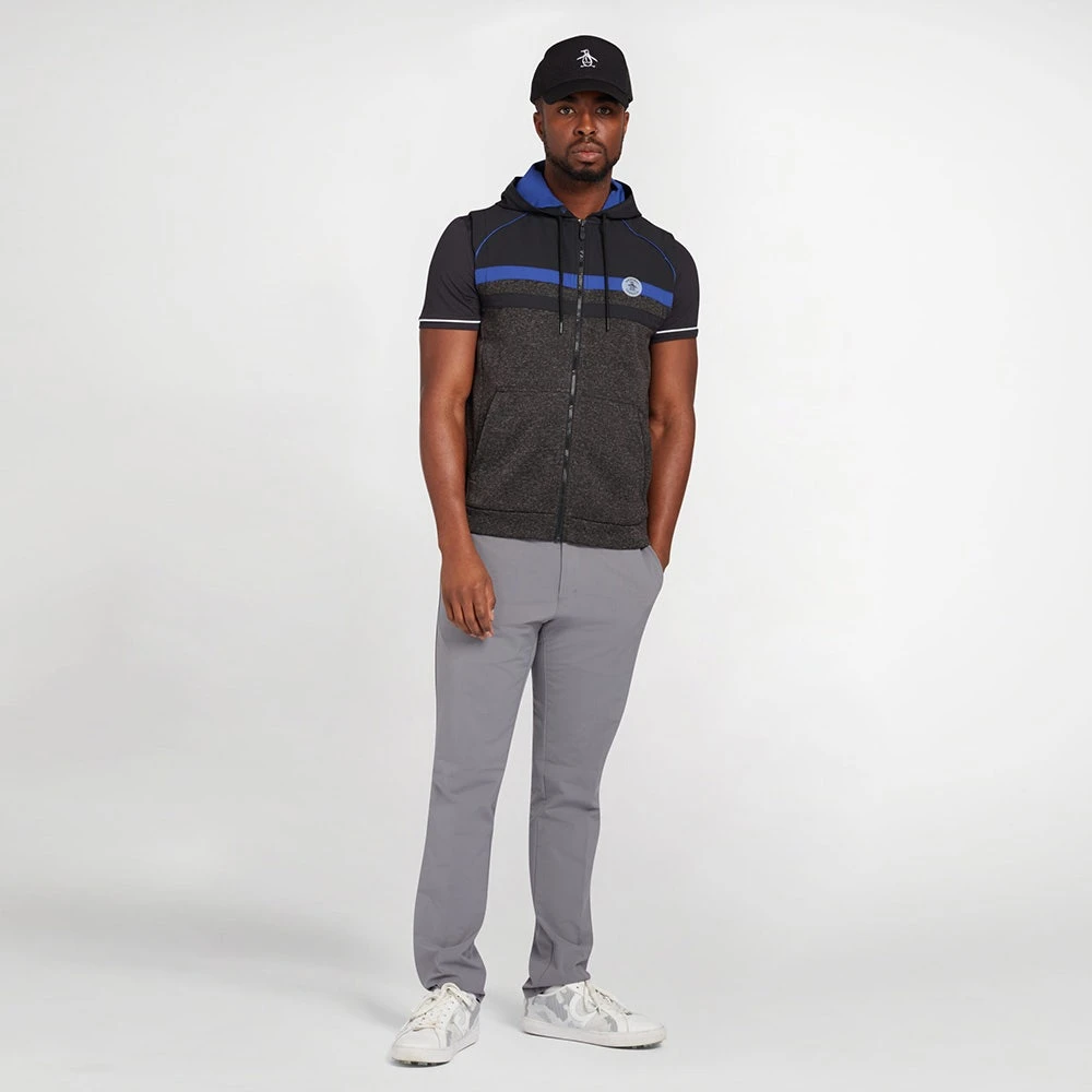 Original Penguin is one of the newest brands to arrive online at Golfposer & this mid weight hooded golf vest is one of the top picks from the latest collection. The lower panel makes use of a soft heathered knit fabric which has a soft handle for complete warmth and comfort, while the upper panel has a woven finish for added performance and visual interest. The full zip hooded silhouette is both unique and convenient for wearing on and off the course this season – ideal for layering up when conditions are on the cooler side. Another top quality mid layer option which looks especially fashionable in this colour combination, complete with a rubberised patch logo at the left chest.