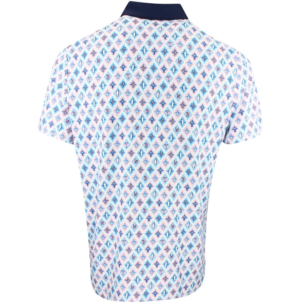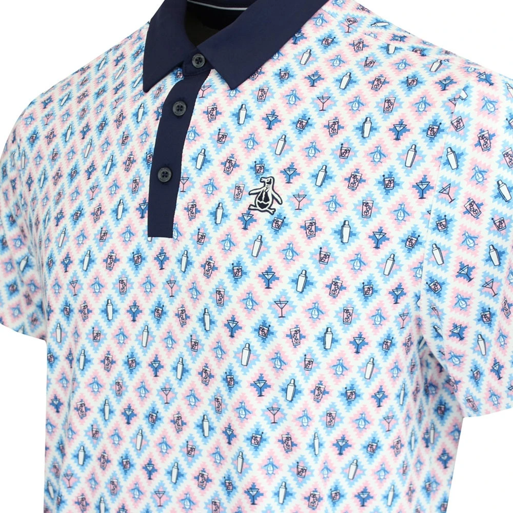 Original Penguin golf shirts are up there with the best in the game and we love this new style which has arrived from the AW23 collection. It’s a technical, performance-driven style which embraces an all over “Atomic Cocktail” geometric print – a fun design which also features a variety of motif logos within the diamond grid pattern. The soft and flexible fabric offers supreme comfort with freedom of movement and moisture wicking performance, while the signature OPG fit and hem vents allow this style to be worn untucked with ease. The “Sticker Pete” logo is located at the left chest and helps to round off another outstanding polo shirt from Original Penguin.