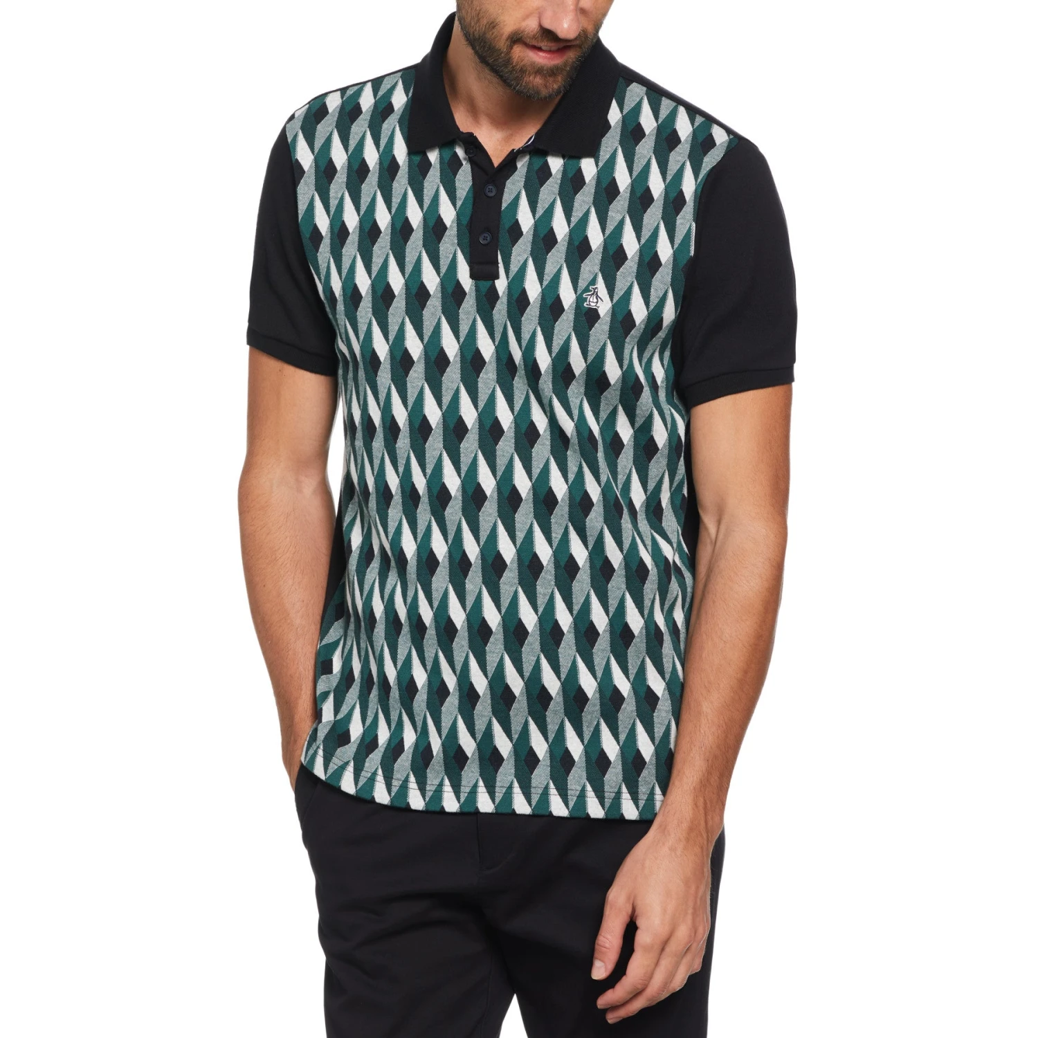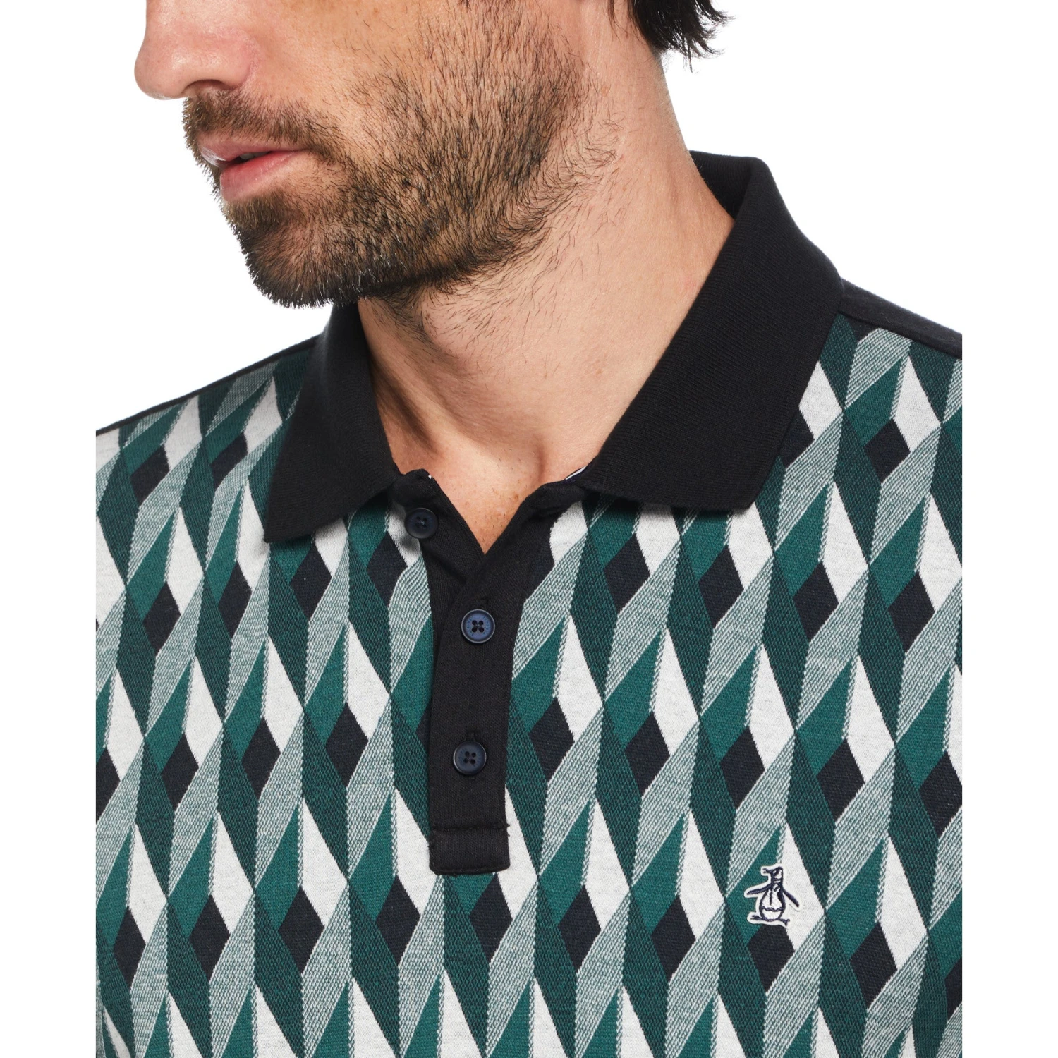 Shine bright like a diamond in this unique textured polo from Original Penguin. Featuring a classic polo collar and modern slim fit, it’s easy to dress it up or down. The durable jacquard fabrication weaves a subtle two-color geometric diamond print into the material, creating a sophisticated and eye-catching pattern. Designed with stretch fabric, this men’s polo ensures maximum comfort and freedom of movement, making it the ultimate choice for casual outings, business events, or weekend getaways.