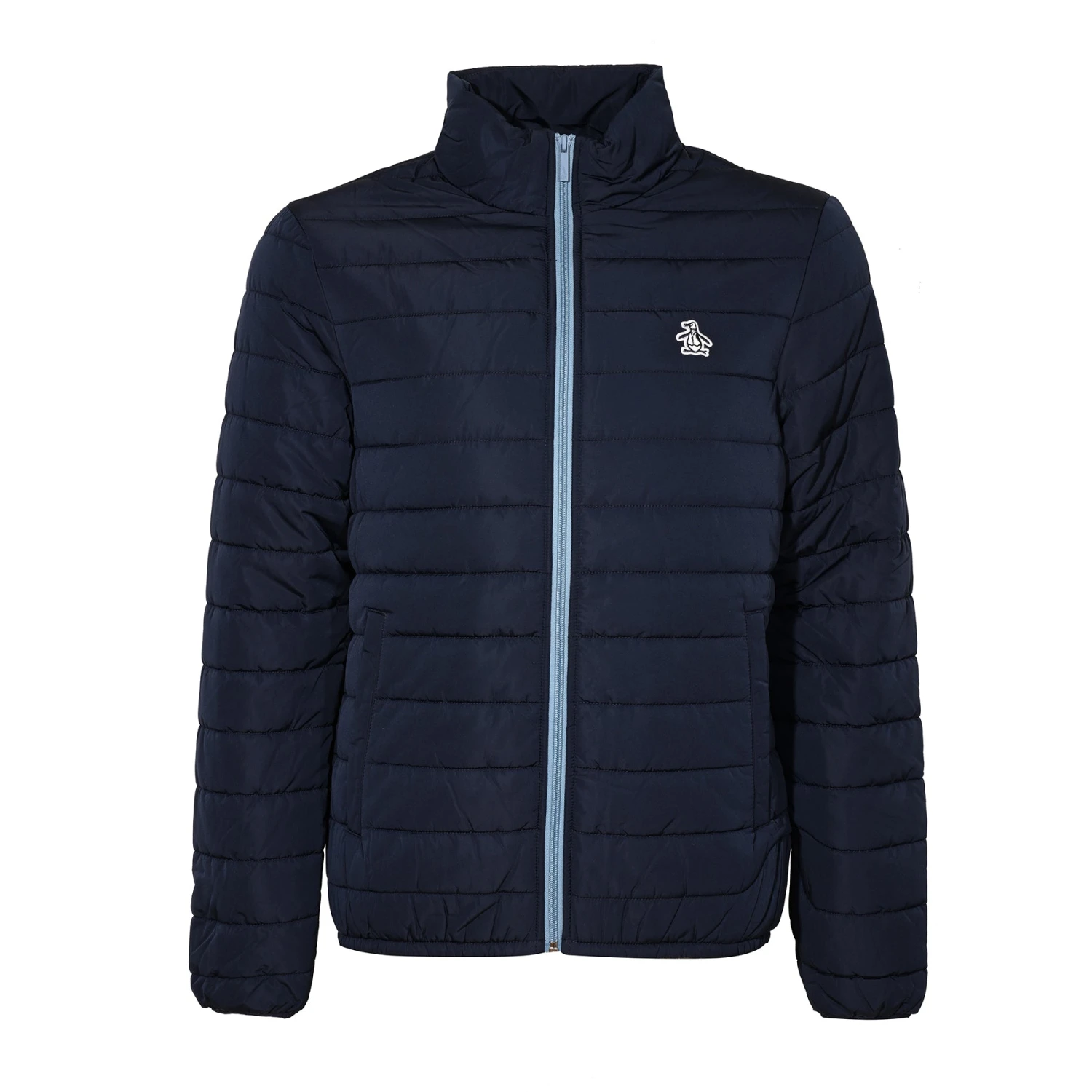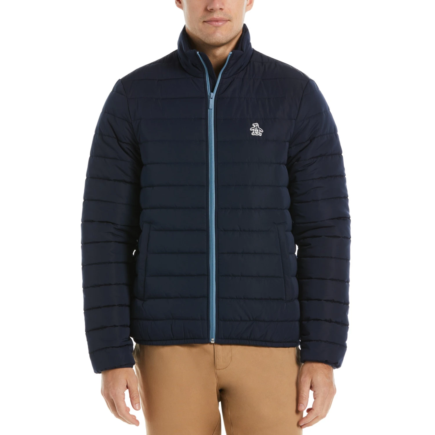 Stay warm and comfortable in this Original Penguin lightweight filled puffer jacket. Plain weave fabrication adds durability, and a water-resistant, high-density surface helps keep you dry. Zippered pockets help keep your items secure, while the high mock neck collar offers extra protection from the elements, so nothing holds you back on cold days.