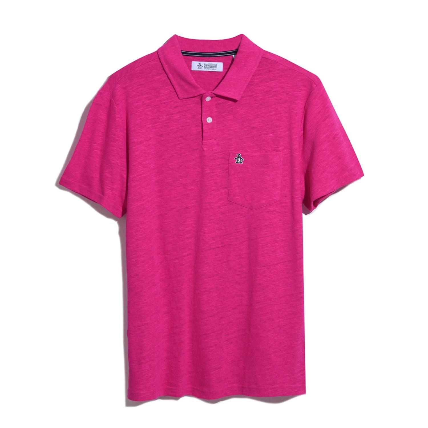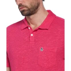 Experience both comfort and style with this Original Penguin polo shirt for men. Crafted from a premium linen-cotton blend jersey fabric, this polo top has a soft feel for all-day wear. The two-toned slub material offers an elevated look while short sleeves make it perfect for warm weather. This men’s polo is the ideal choice for casual elegance.
