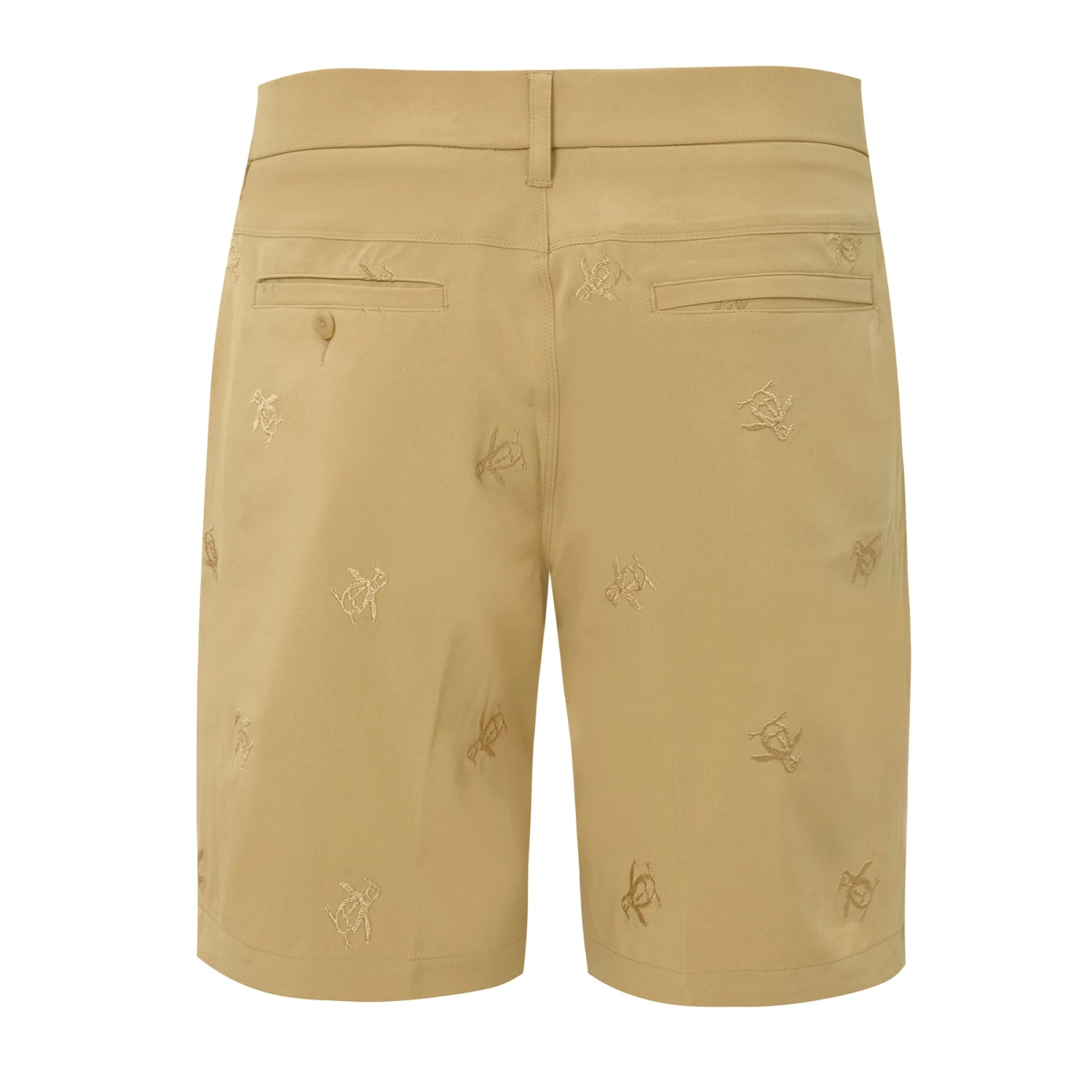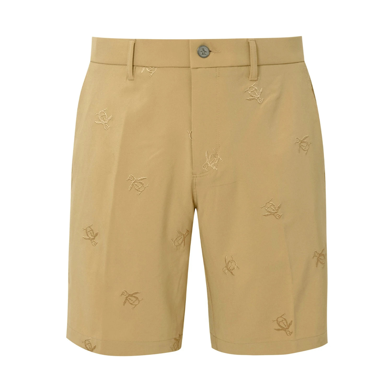 Pete helps you ace your on-course style with these fun and functional Original Penguin men’s golf shorts. The sleek flat-front design features an allover embroidered Pete pattern for true Original style. These golf shorts are equipped with built-in moisture wicking and four-way stretch for lasting comfort. The covered elastic waistband has an anti-slip interior silicone gripper to keep your shirt neatly in place as you bend and swing. Featuring durable plain weave fabrication with recycled polyester content, these sustainable and stylish shorts will take you from the course to the clubhouse with ease.
