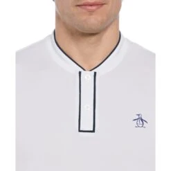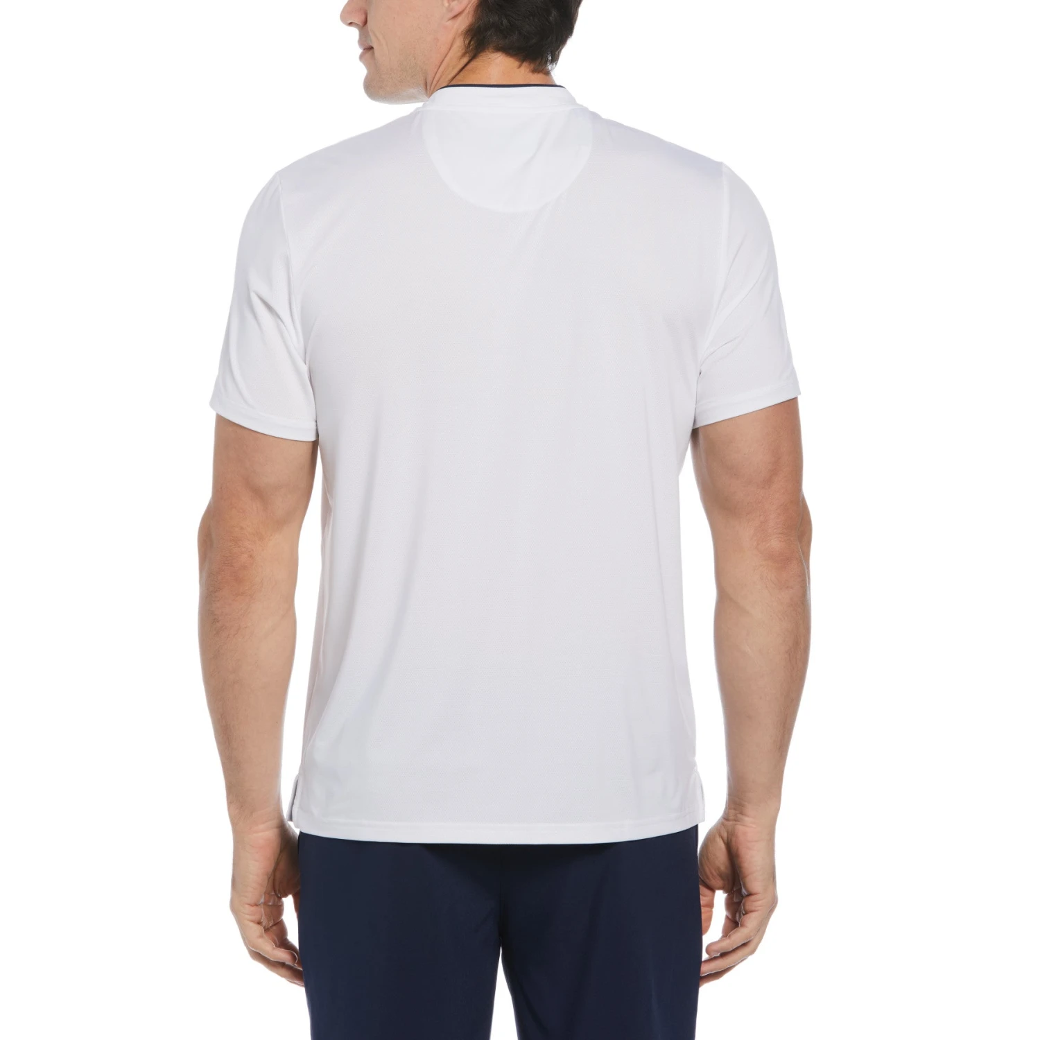 Sustainability and style come together in this sharp 35% recycled polyester men’s tennis polo from Original Penguin. The shirt’s lightweight single knit fabric is equipped with moisture wicking and stretch properties to help ensure comfort and freedom of motion during matches. The short sleeve tennis shirt’s sleek blade collar features contrast piping for added definition, and it extends down the placket for extra style points. A versatile addition to your tennis clothes, this polo shirt features a Pete logo on the left chest for a fun finishing touch.