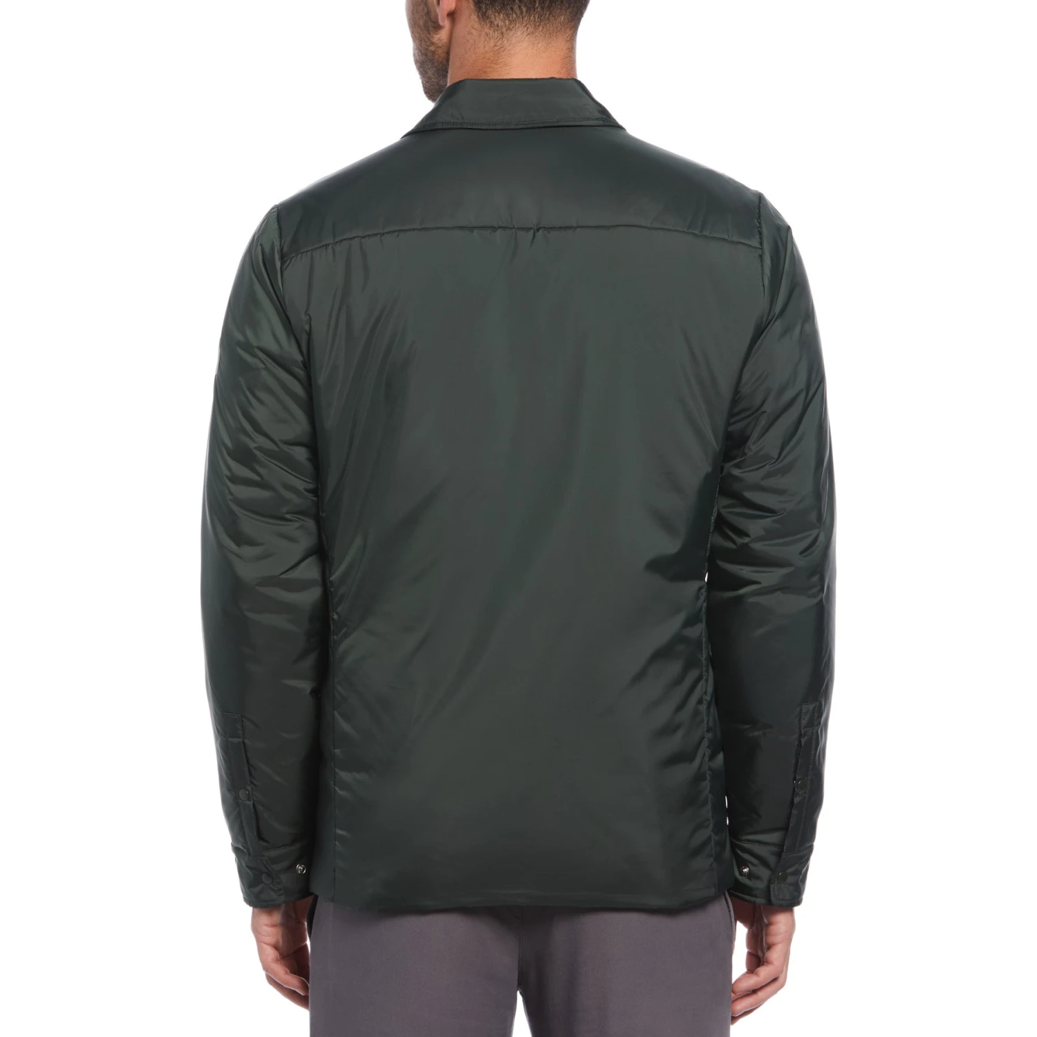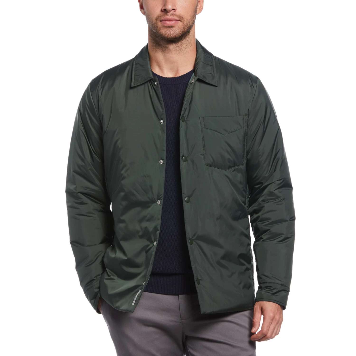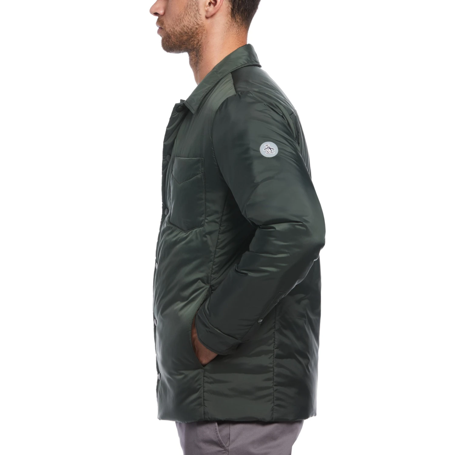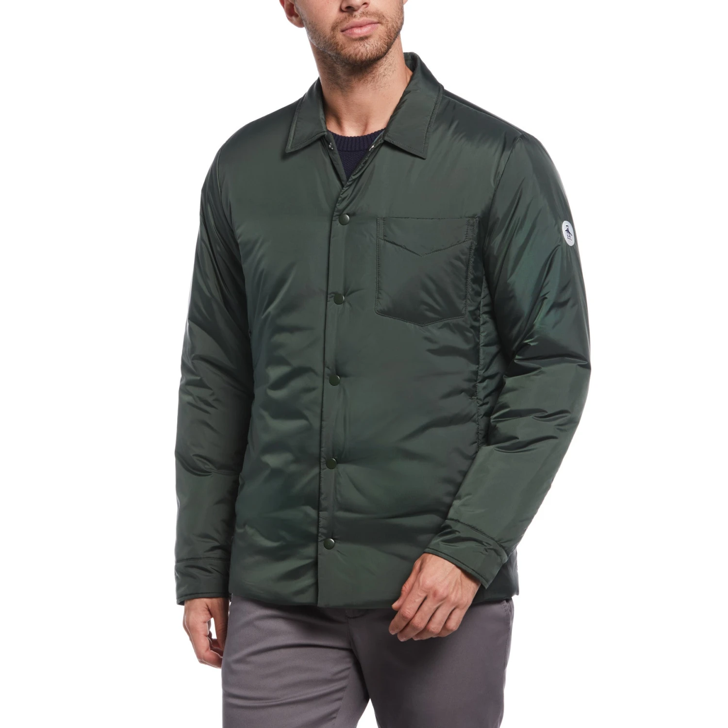 Throw on this lightweight shirt jacket from Original Penguin when you want an extra layer to keep you warm on cool days. Made from 100% recycled polyester, taffeta fabrication creates a crisper material that has a sheen. It’s water-resistant to help you handle the elements and has poly filling for warmth. The button-up closure lets you decide how you want to wear it – open, buttoned up or just a few buttons. A small pocket stands out on the chest of this men’s shirt jacket.