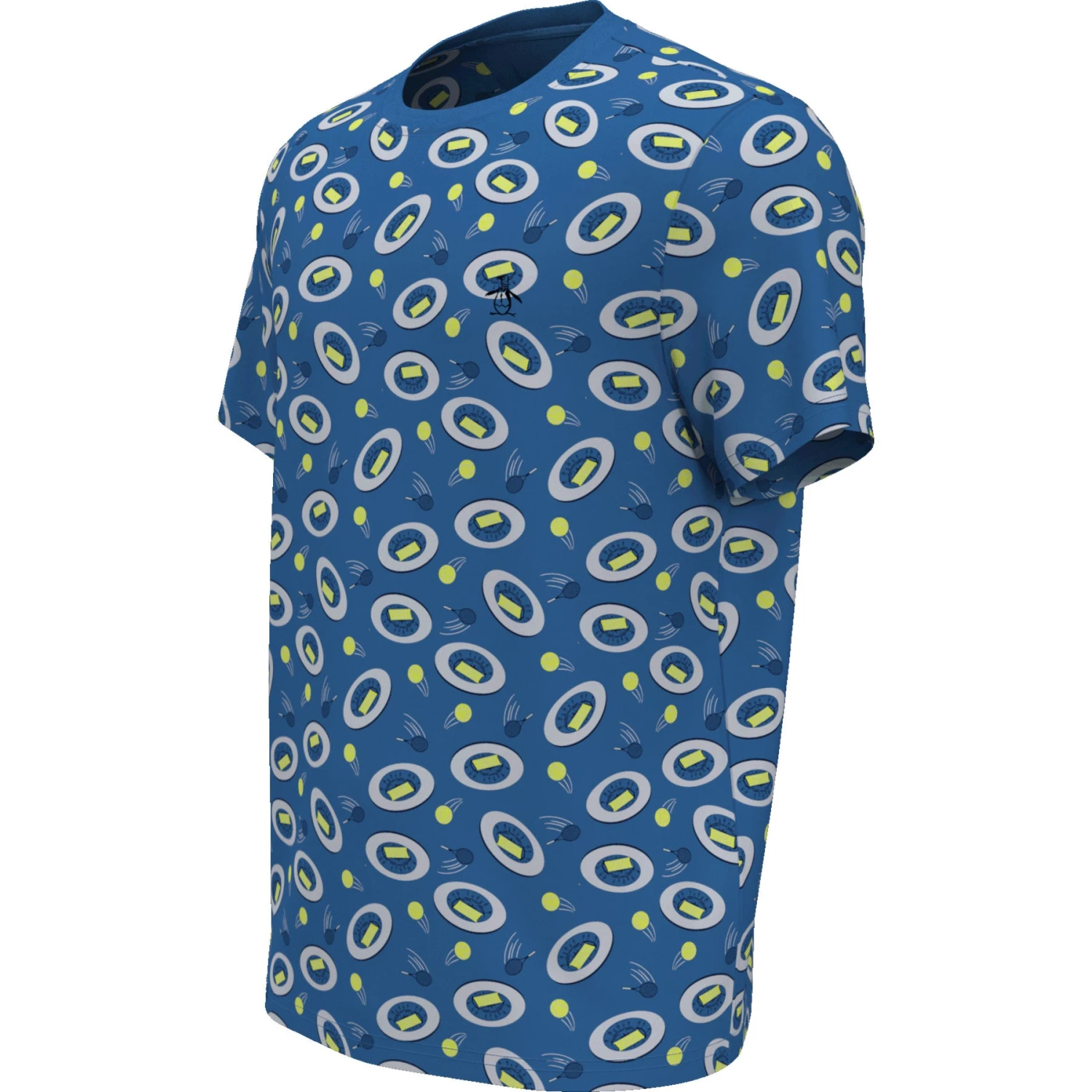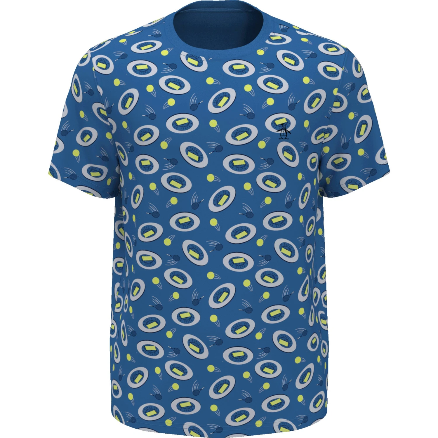 This Original Penguin men’s printed shirt features an eye-catching tennis inspired print making it a fun and fashionable addition to any wardrobe. The single knit fabric enhanced with stretch provides lightweight flex, ensuring a perfect fit that moves with you. Made from 44% recycled polyester sourced from plastic bottles, this eco-friendly men’s short sleeve shirt not only looks great but also supports a greener future.