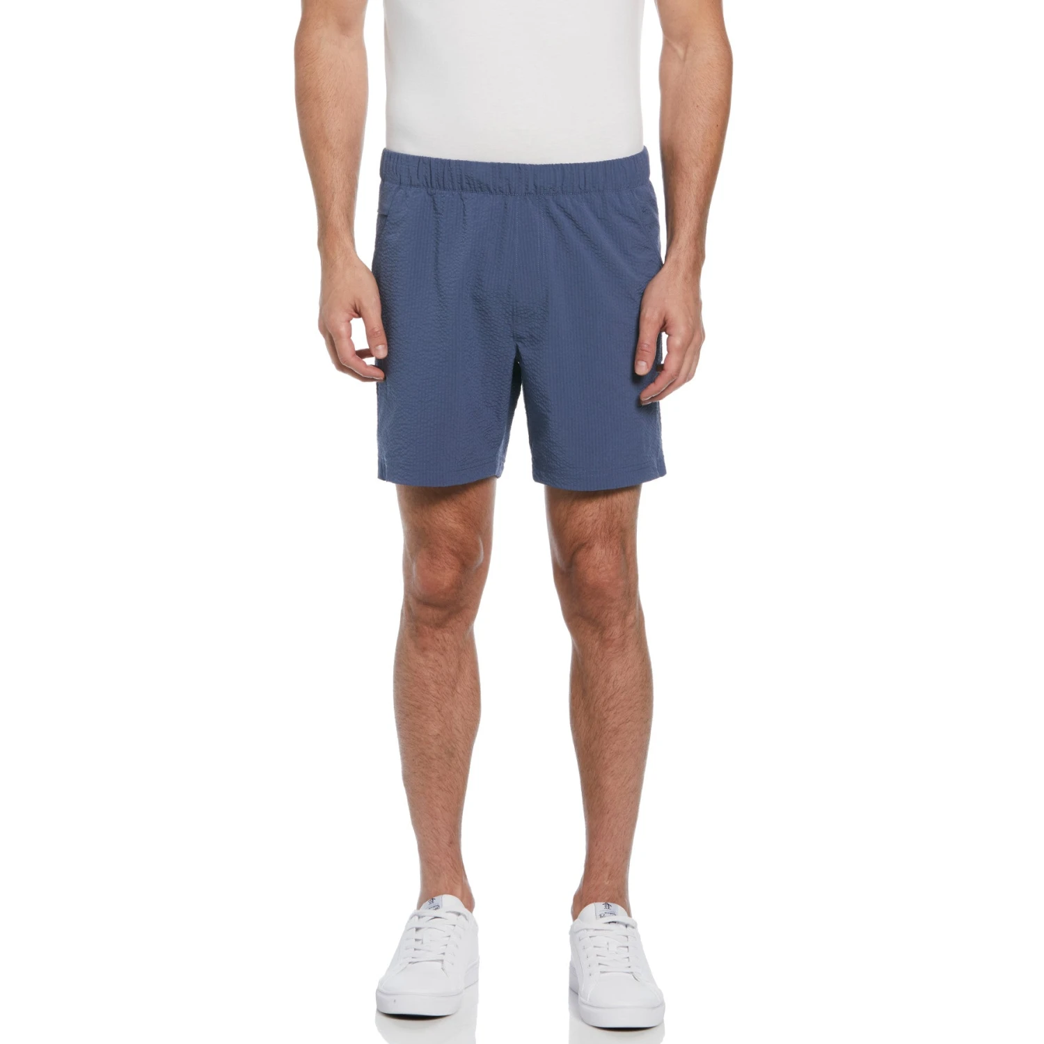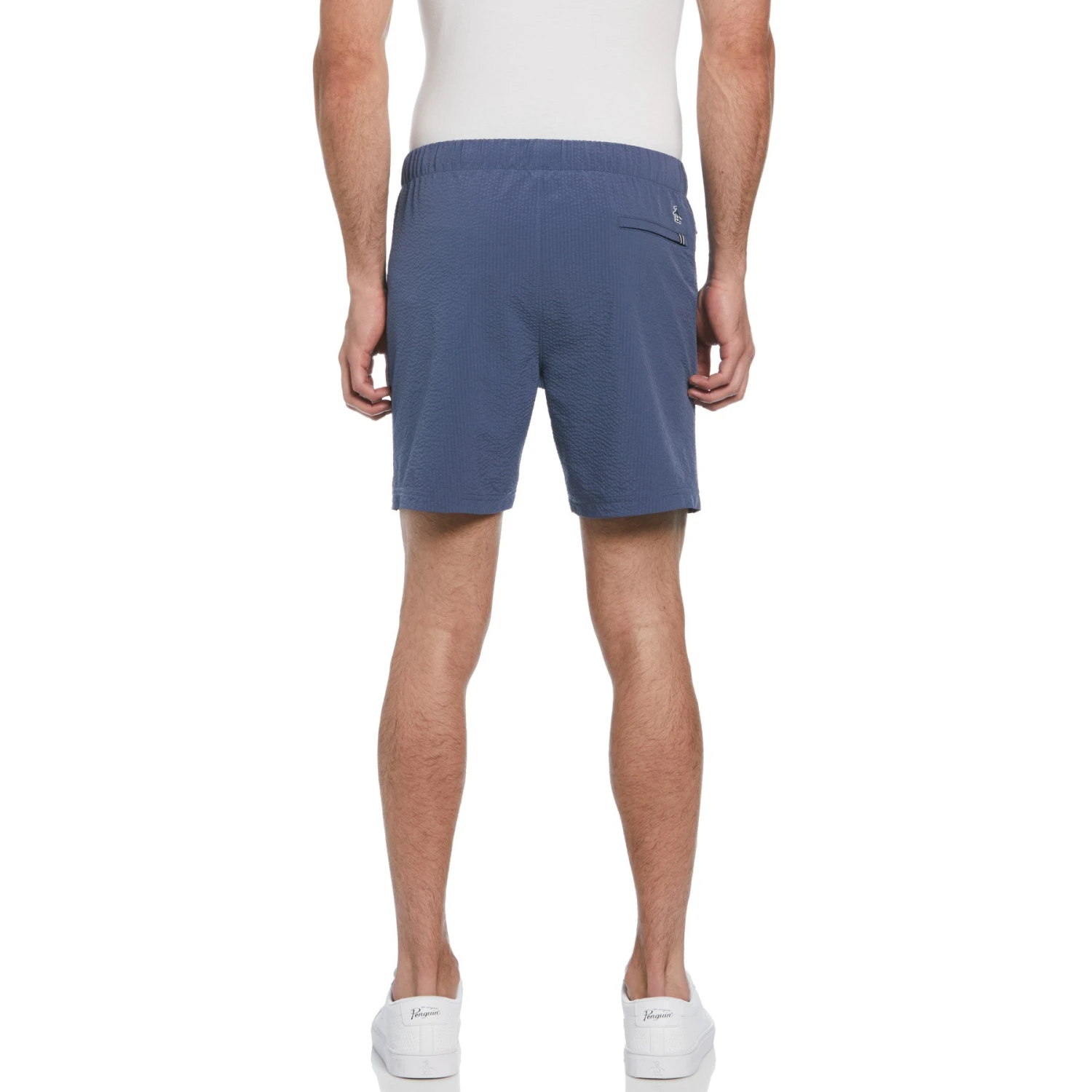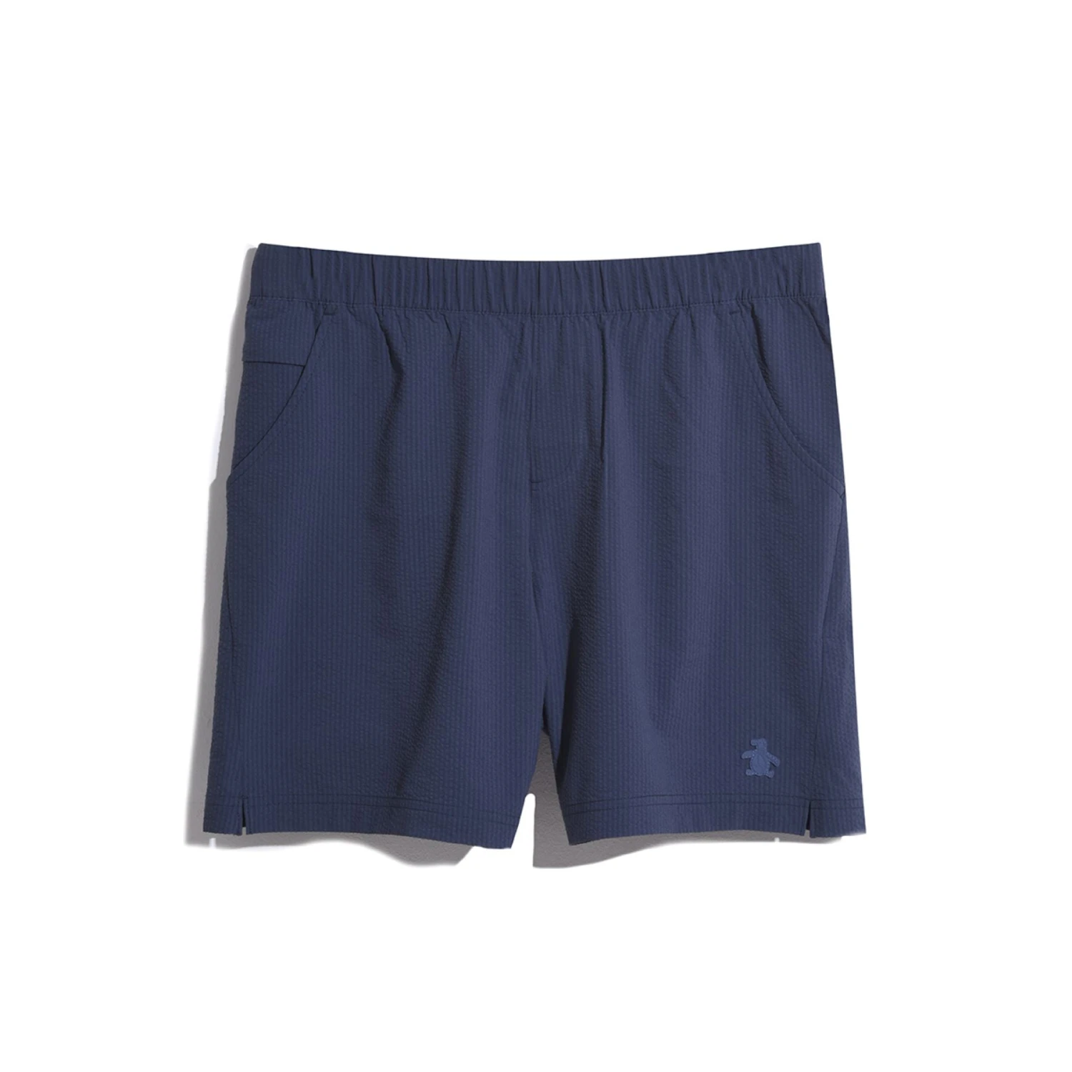 Expand your warm weather wardrobe with these comfortable men’s shorts from Original Penguin. The guys’ shorts feature an elastic waistband with a drawstring for a customized fit. Seersucker fabric gives them a lightweight feel and a classic textured look. The design is further enhanced with zippered side seam pockets and a back pocket, which provide practical storage. Made from 74% recycled polyester, these shorts represent a perfect fusion of style, comfort, and sustainability.