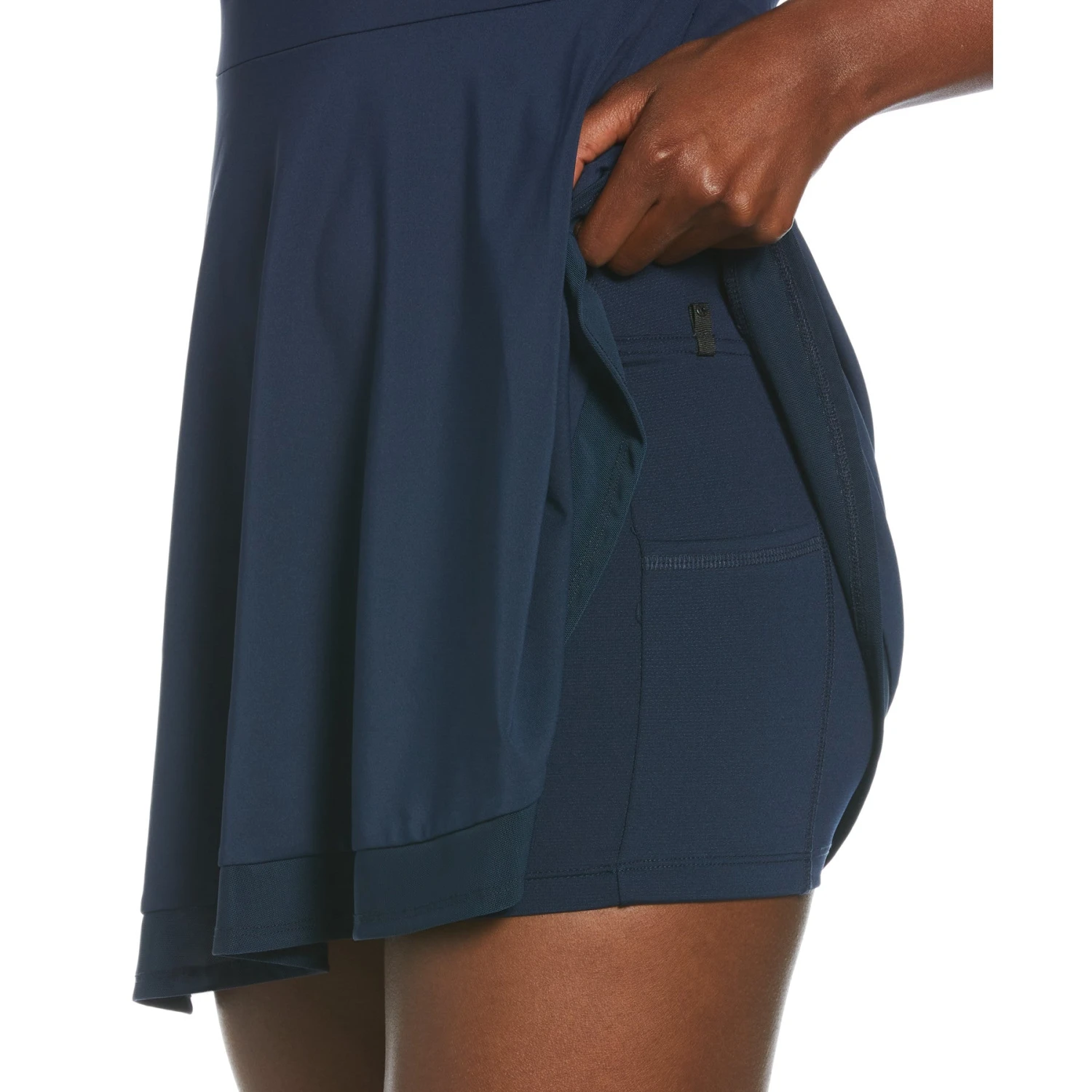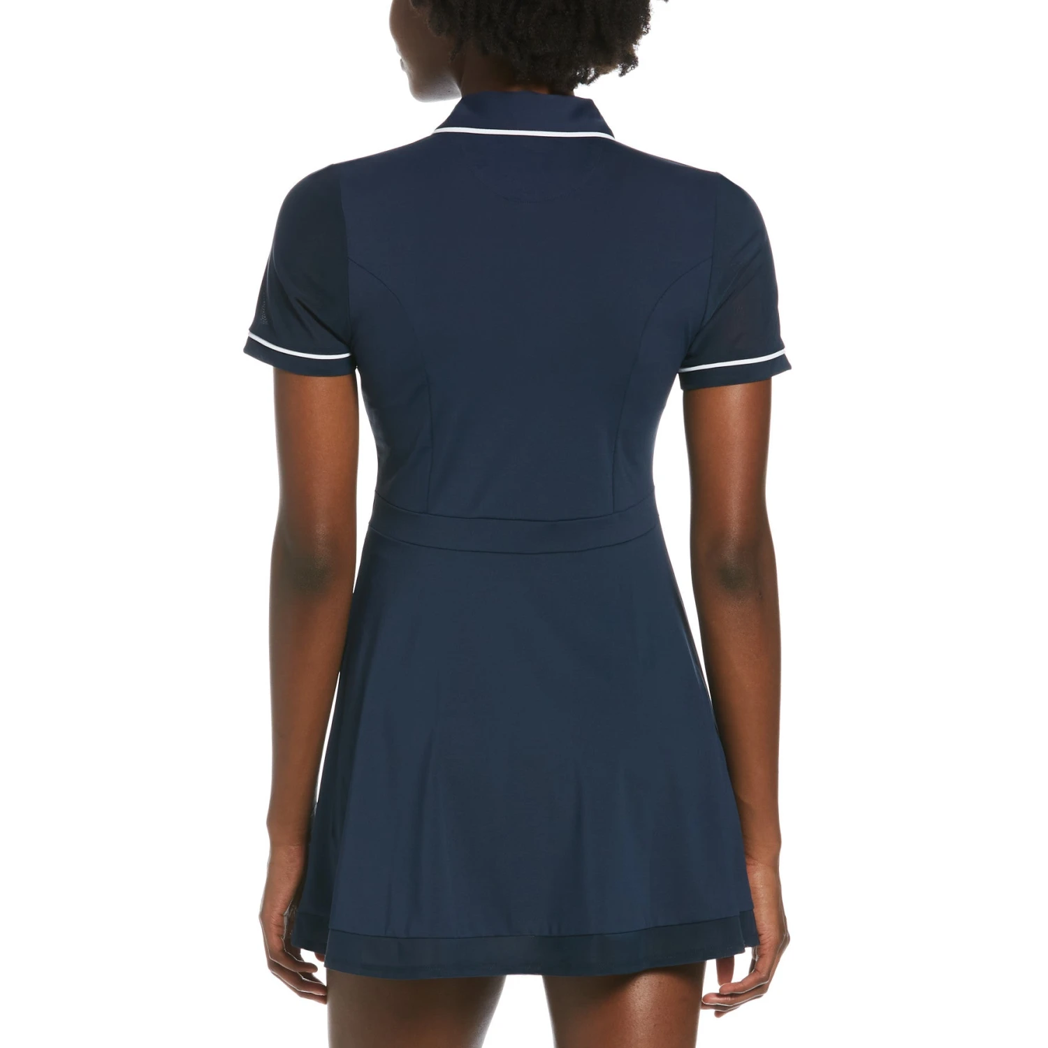 Play to win in the Veronica golf dress from Original Penguin. This short sleeve women’s dress features mesh sleeves and hem for enhanced breathability and added stretch for a flexible fit as you bend and swing. Moisture-wicking technology keeps you feeling dry and the internal shorts provide comfortable coverage.Â