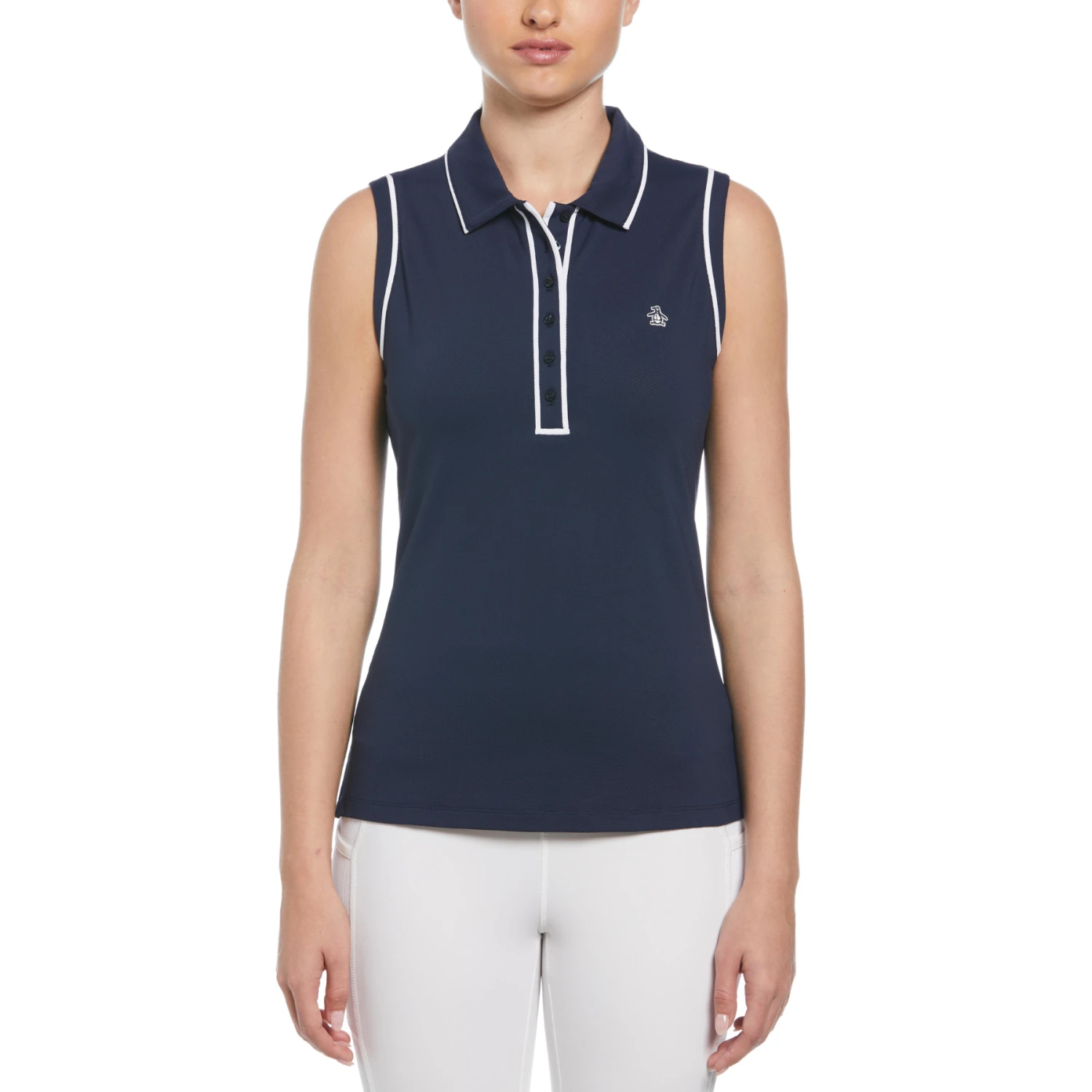Get the perfect blend of style and comfort with this Original Penguin women’s golf polo shirt. Crafted with pique fabric, this golf top has raised cords woven into the material to add texture and give your golf outfit a refined touch. The sleeveless design and contrast piping details elevate the overall look, making this golf top a great choice for your next game or casual wear.