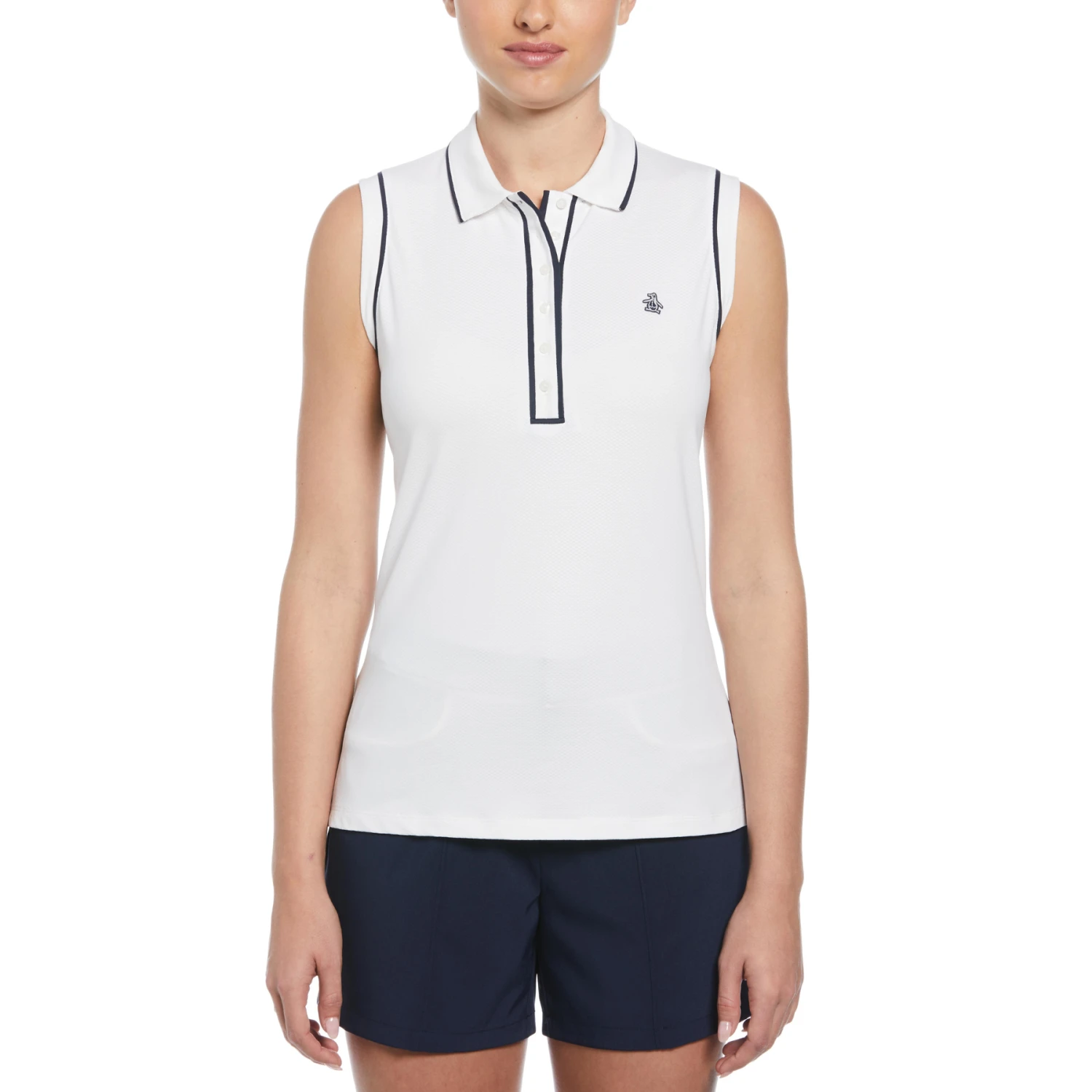 Get the perfect blend of style and comfort with this Original Penguin women’s golf polo shirt. Crafted with pique fabric, this golf top has raised cords woven into the material to add texture and give your golf outfit a refined touch. The sleeveless design and contrast piping details elevate the overall look, making this golf top a great choice for your next game or casual wear.